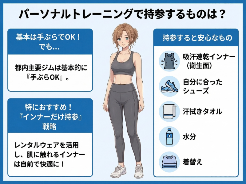 都内主要ジムは基本的に「手ぶらOK」です。とはいえ、持っていくと安心なものがあります。